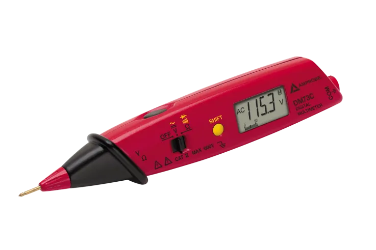 The Amprobe DM73C is a pen-style digital multimeter designed for one-handed operation, featuring AC/DC voltage measurement, resistance, diode testing, and an audible continuity check.