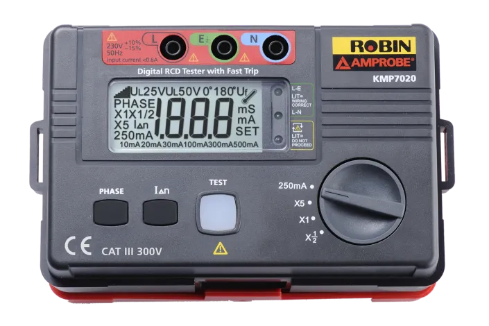The Beha-Amprobe KMP7020 is a user-friendly digital tester designed to verify the correct operation of Residual-Current Devices (RCDs). It features three selectable trip current levels and a fast trip function, ensuring comprehensive testing capabilities for electrical safety compliance.