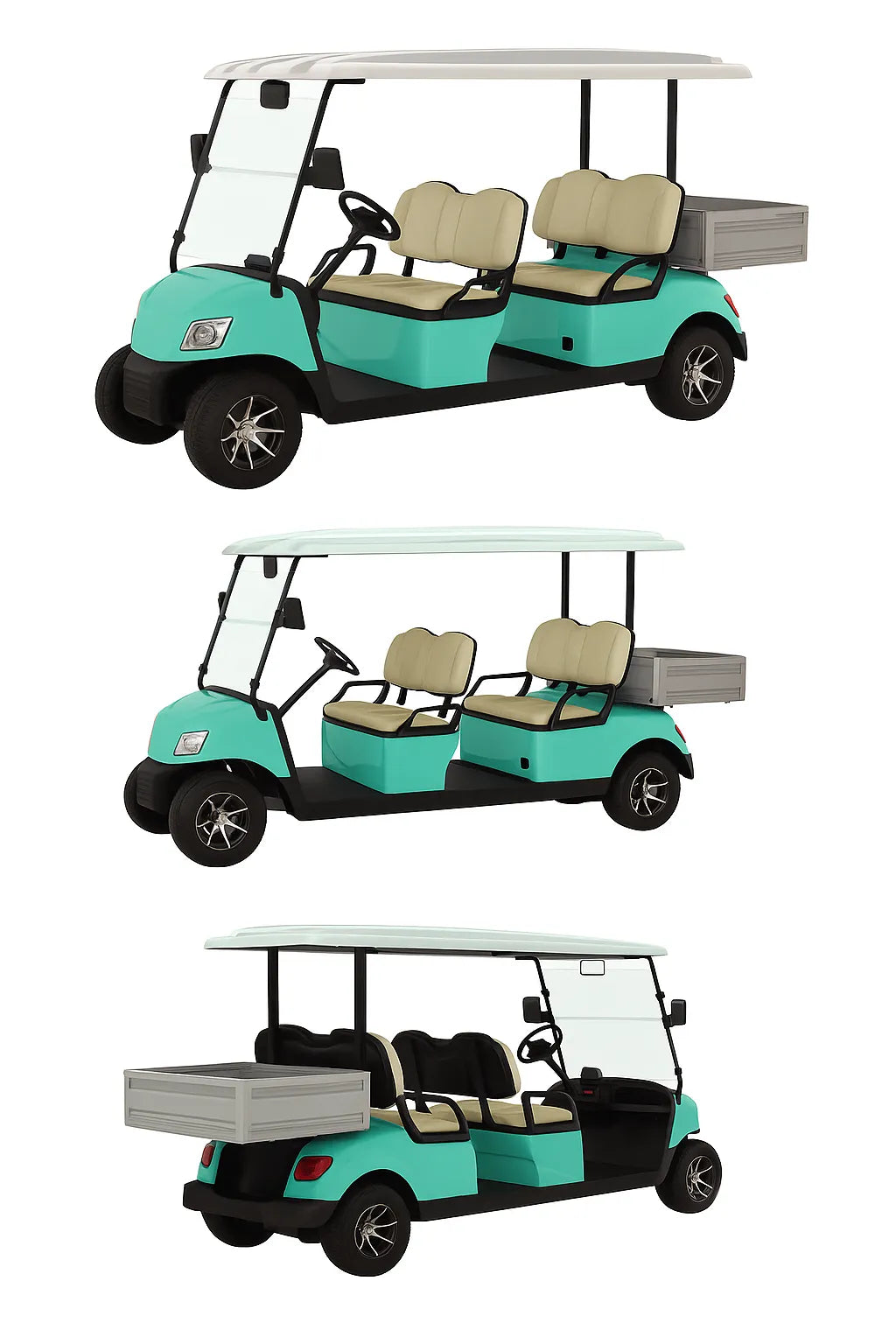 The Destino Kart 4 Seater Electric Golf Cart with Rear Cargo Box is a multifunctional electric vehicle designed to carry both passengers and light cargo with ease. Featuring two bench rows that seat up to four people and a sturdy rear aluminum cargo box, it’s ideal for resort staff, maintenance teams, and internal transport across large campuses or gated communities.
