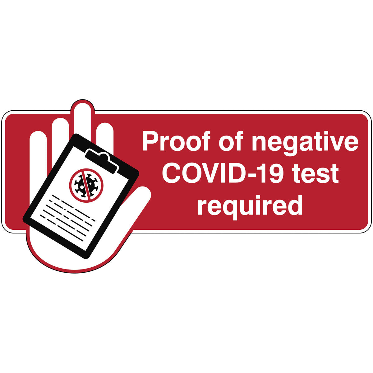 Product form Brady Safety Sign – Proof of Negative COVID-19 Test Required | 300 × 100 mm | White on Red | 310023 Share WhatsApp Deel X Pin it Messenger Email SKU: 310023 Shipped today? Order within: Mar 07, 2026 17:00:00 +0300 Out of stock Shipped today? Order within: Mar 07, 2026 17:00:00 +0300