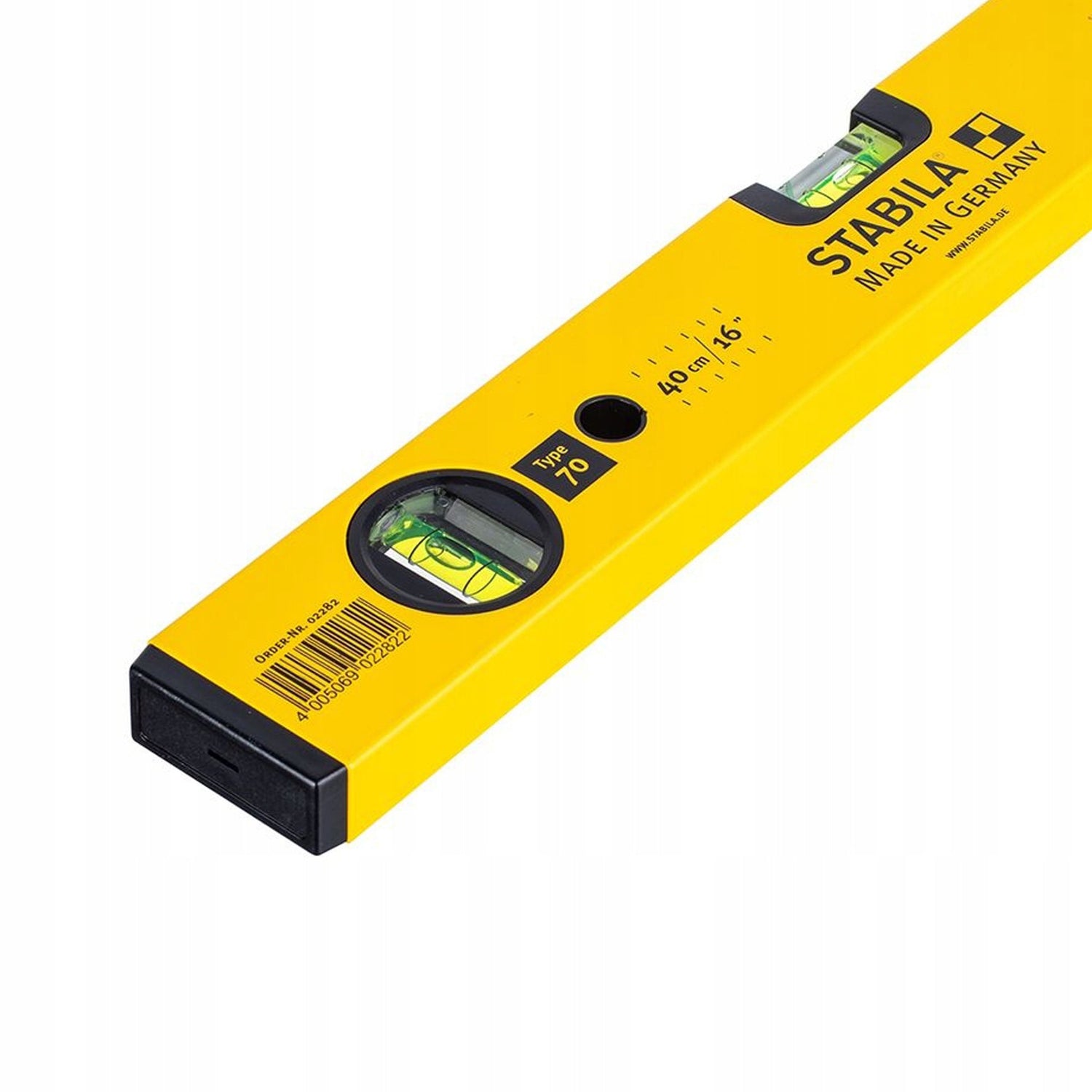 The STABILA Type 70 Spirit Level is a preferred choice among professional builders due to its lightweight, reliability, and high accuracy. This spirit level is part of the classic Type 70 series, known for its ease of use and comfort. It features a robust aluminum rectangular profile that ensures long-term durability and accuracy, thanks to the precisely aligned vials that are locked in place. The spirit level is suitable for a wide range of leveling tasks across spaces measuring from 30 cm to 200 cm, making it versatile for various applications in joinery, electrical installations, tiling, and more. The smooth, electrostatically powder-coated surface is easy to clean and helps protect delicate surfaces, while the plastic end caps provide impact protection.