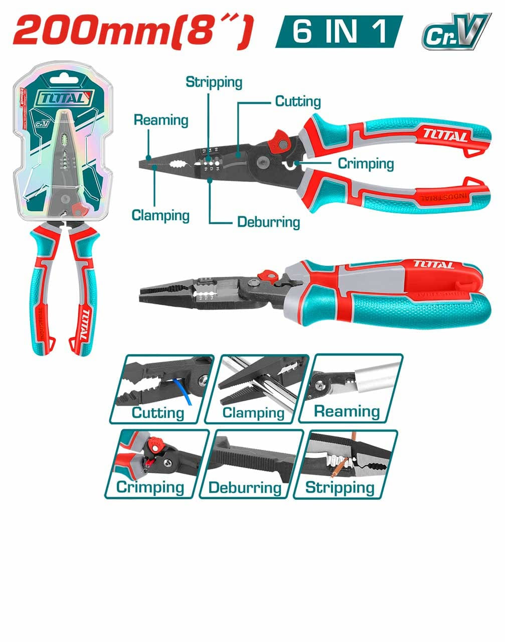 Versatile 6-in-1 long nose pliers with durable Cr-V steel and comfortable TPR handle.