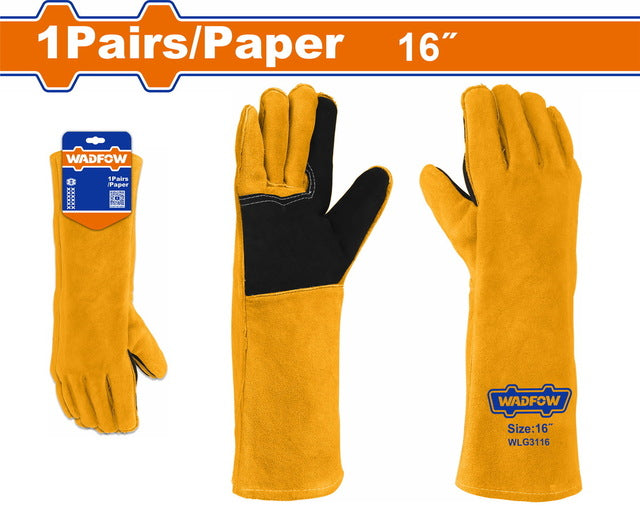 The WADFOW 16'' Leather Welding Gloves (WLG3116) are designed for professional welders and industrial workers who require maximum protection and comfort. These gloves are crafted from premium cowhide leather, offering exceptional durability and a soft feel for all-day wear. The extended length provides added protection for the forearms, making them ideal for welding and other high-heat applications. Reinforced stitching and stress points ensure that these gloves can withstand the rigors of heavy-duty use, while the gunn cut and keystone thumb design promote dexterity and ease of movement. Perfect for a variety of tasks, from welding to woodworking, these gloves offer reliable protection and excellent grip.