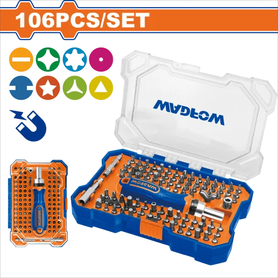 Versatile 106-piece ratchet screwdriver set for all fastening needs.