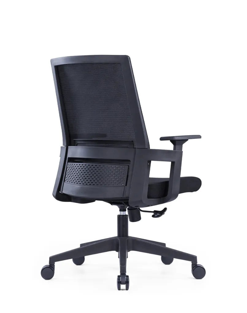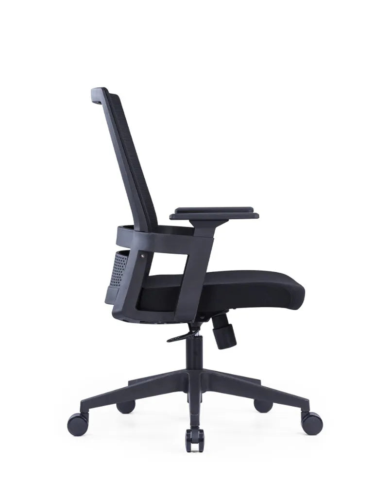 كرسي مكتب بظهر متوسط، إطار نايلون أسود مقوّى بالألياف الزجاجية، حشوة رغوة مصبوبة بدون غطاء مقعد، دعم قطني قابل للتعديل، مساند ذراعين ثابتة، قفل بسيط، قاعدة نايلون، عجلات PU سوداء 60 مم.