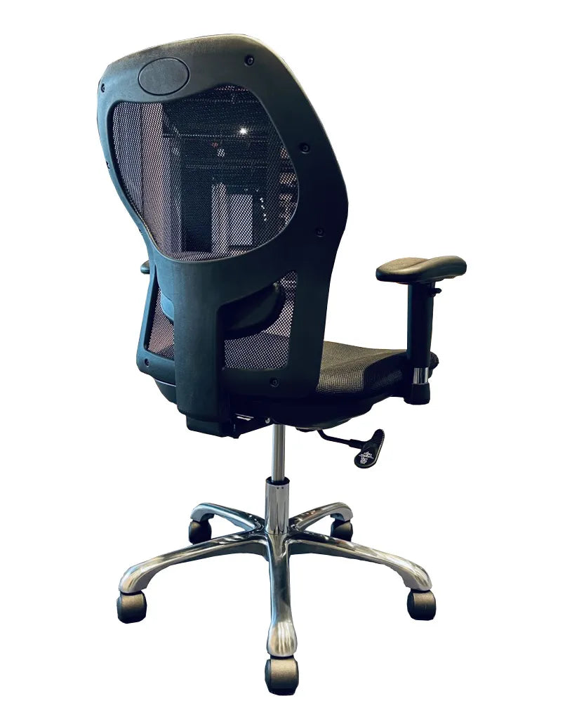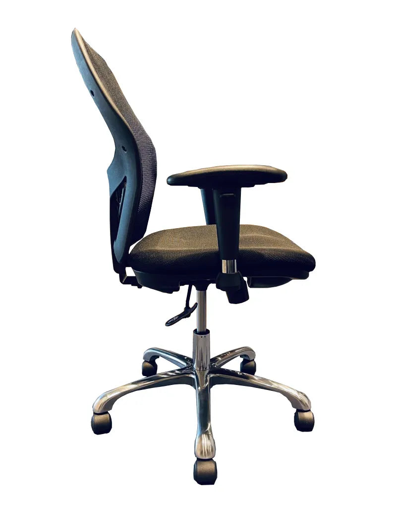 كرسي مكتب بظهر متوسط بإطار نايلون ألياف زجاجية، مساند ذراعين ثنائية الأبعاد، حشوة رغوة عالية الكثافة، دعم قطني قابل للتعديل، وقاعدة ألمنيوم مصبوبة.