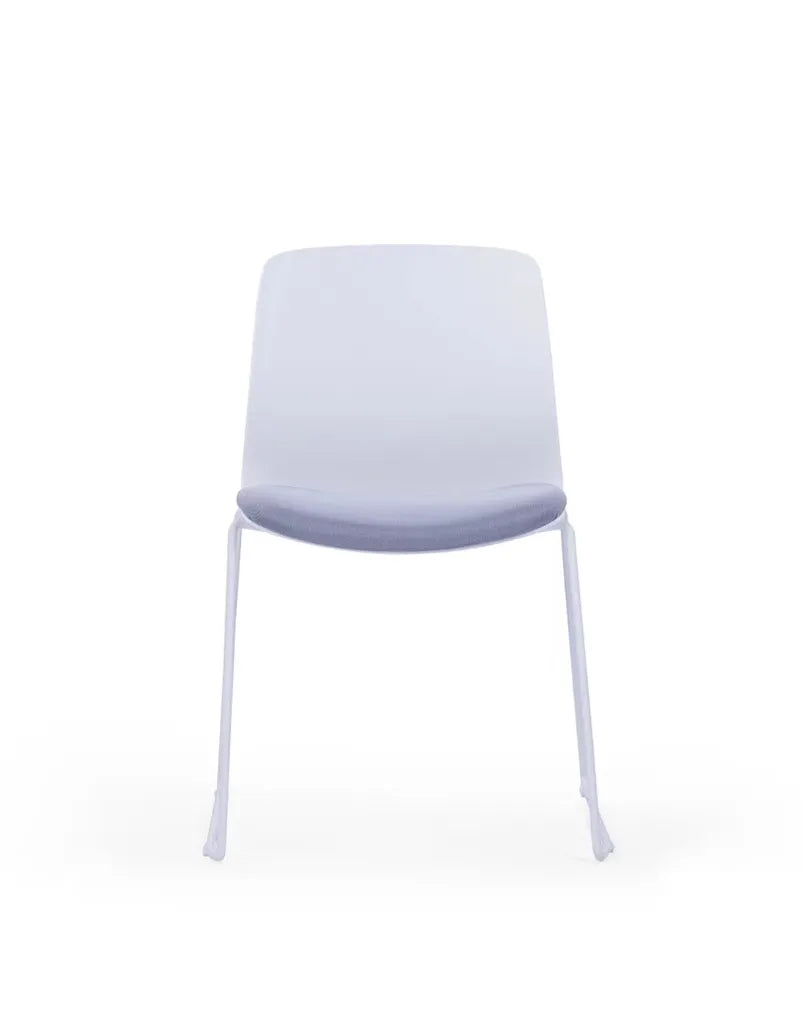 المقعد القماشي الرمادي ناعم الملمس ويوفر راحة ممتازة أثناء الجلوس القصير، سواء في استراحة الموظفين أو أثناء انتظار الزوار. القاعدة مصنوعة من فولاذ مطلي بالبودرة باللون الأبيض، ما يمنح الكرسي ثباتًا ومتانة ومقاومة للصدأ.
