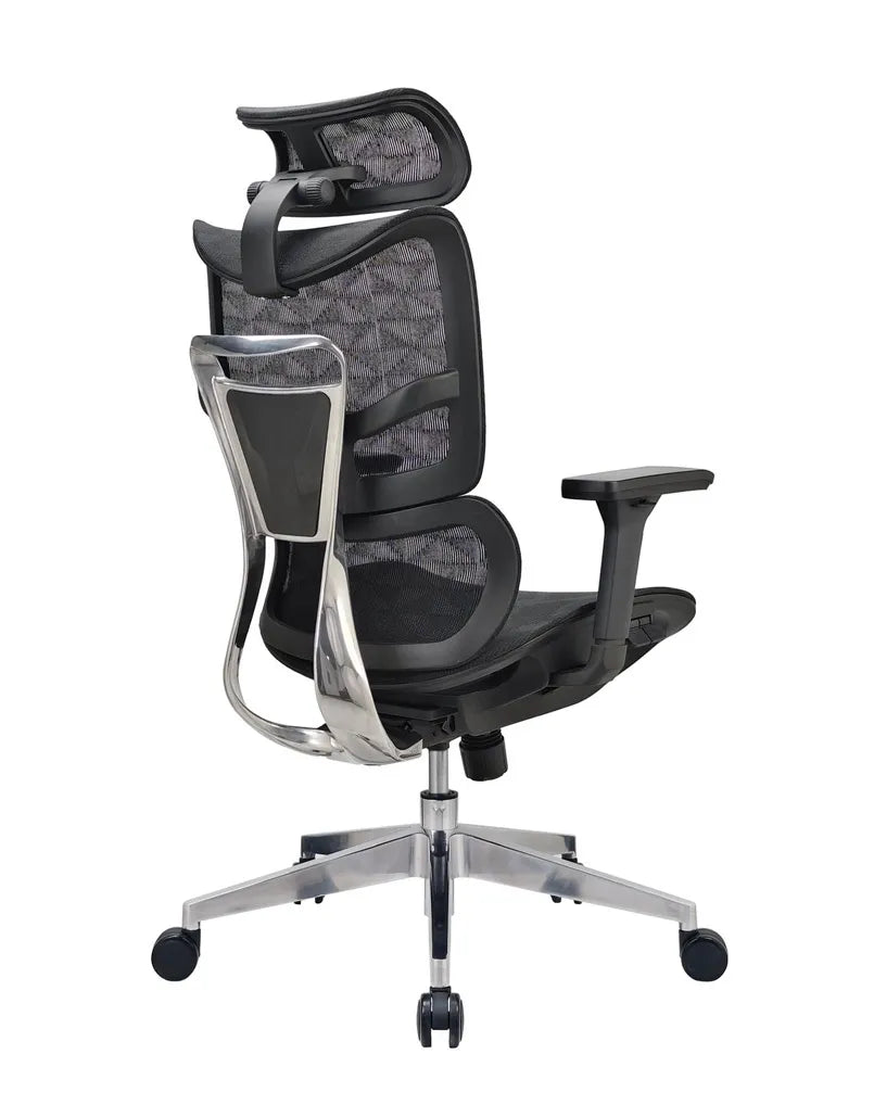 يعتمد مسند الظهر الشبكي ثلاثي التعزيز على إطار من الألياف الزجاجية الهجينة لتوفير دعم قوي مع تهوية مثالية. المقعد المصنوع من قماش شبكي مرن مزود بإمكانية تعديل عمق الجلوس حسب حاجتك، بينما توفر آلية الإمالة المتزامنة 4 أوضاع قفل وخاصية ضبط قوة الميل لراحة مخصصة.