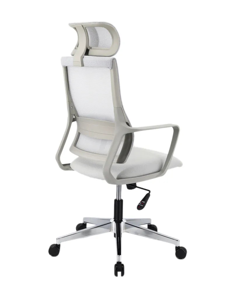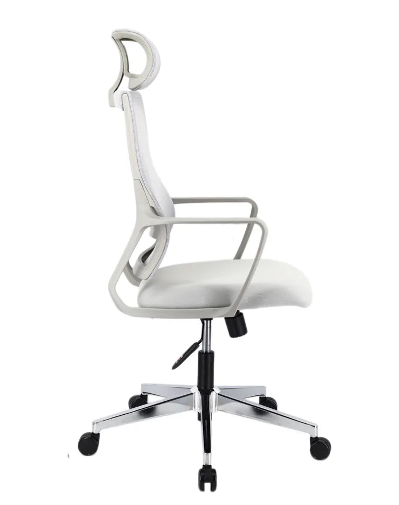 كرسي تنفيذي مريح ظهر عالي بمقعد قماشي، قاعدة كرومية، عجلات PU، دعم قطني قابل للتعديل ورفع هيدروليكي للارتفاع.