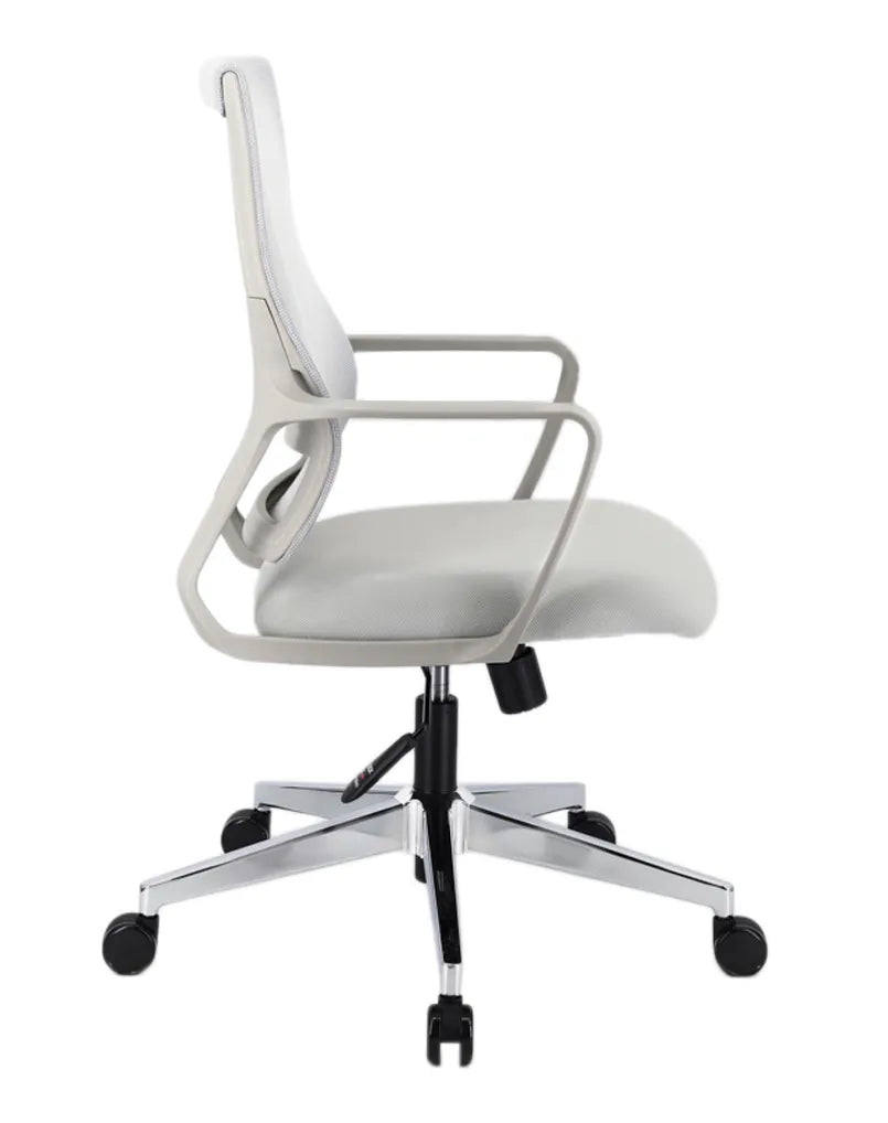 كرسي مشغل مريح ظهر منخفض/متوسط بمقعد قماشي، قاعدة كرومية، عجلات PU، دعم قطني قابل للتعديل ورفع هيدروليكي للارتفاع.